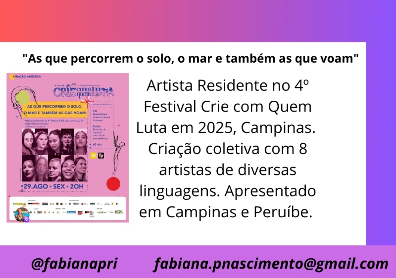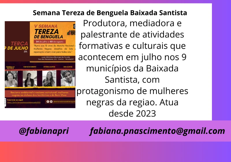 Agente Territorial de Cultura, produtora e pesquisadora cultural, realizadora de diversos eventos multilinguagens e oficinas desde 2020 em Peruíbe.