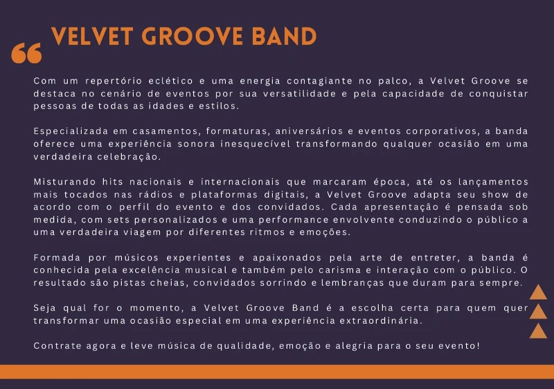 Seja qual for a ocasião, a Velvet Groove Band é a escolha perfeita para quem deseja transformar um momento especial em uma experiência extraordinária.