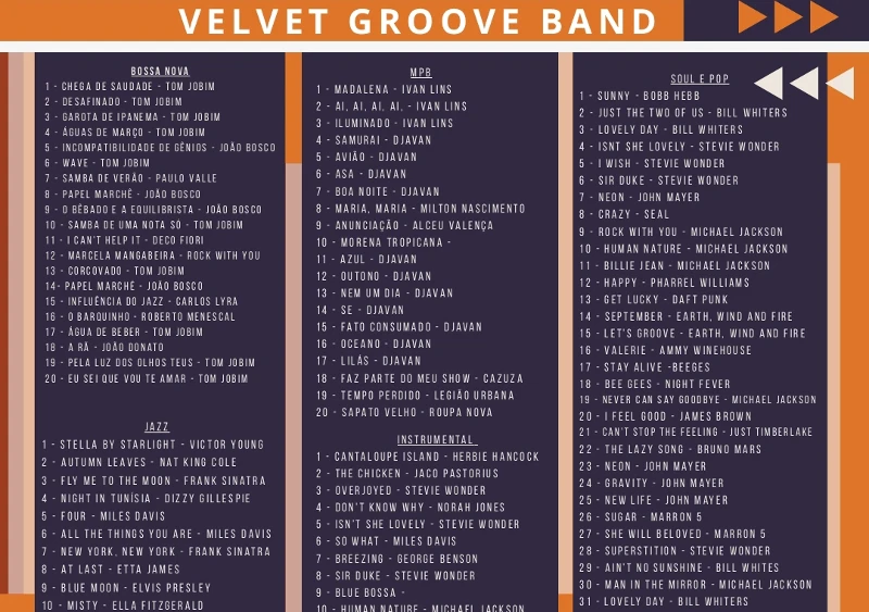 Misturando sucessos nacionais e internacionais atemporais com os mais recentes hits das rádios e plataformas digitais, o Velvet Groove adapta cada apresentação ao evento e aos convidados. Cada show é cuidadosamente elaborado, com repertórios personalizados e uma performance envolvente que leva o público a uma verdadeira viagem por diferentes ritmos e emoções.