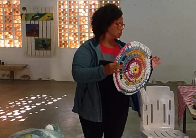 Sou Lucia, mulher negra, mãe, vó, fazedora de cultura, e oficineira. Sou formada em serviço social, íntegro o coletivo ritmos movimentos. Sou artesã na custumizacão de chinelos. Faço um trabalho no movimento de redução do uso de sacolas plásticas, por meio de oficinas ensino a técnica de transforma-las em objetos, tapetes entre outras peças.