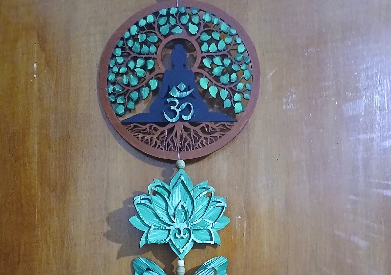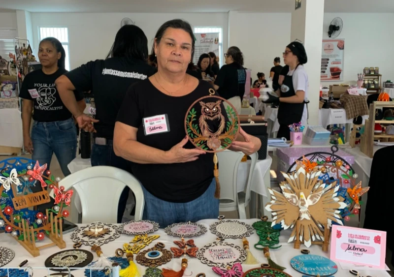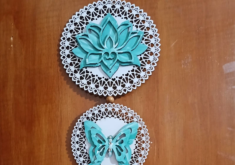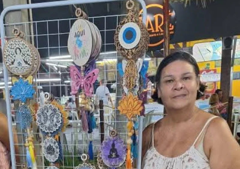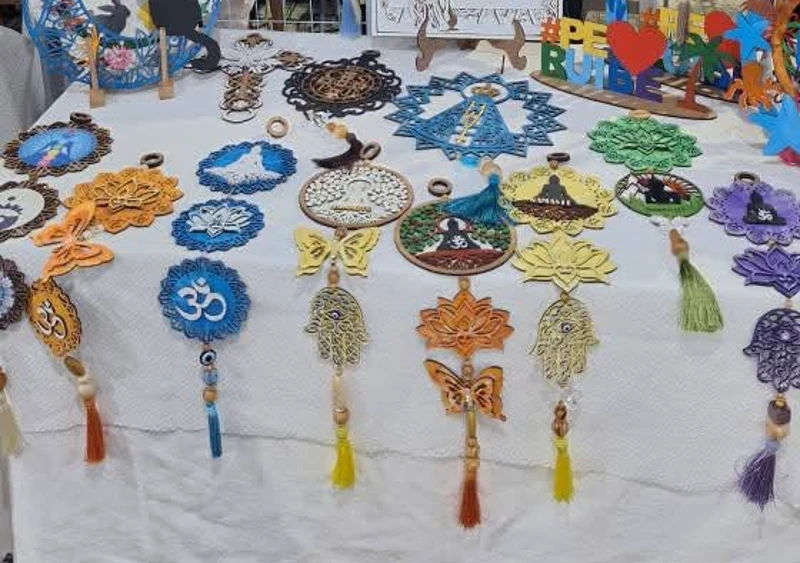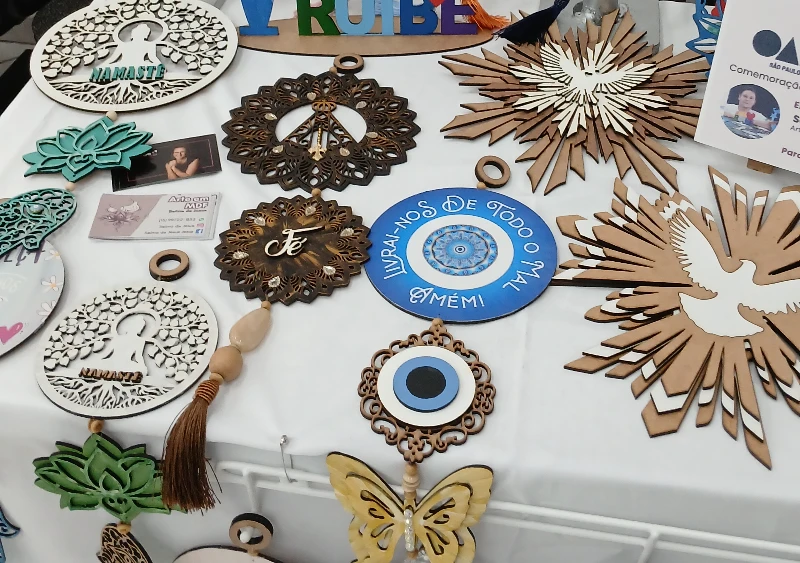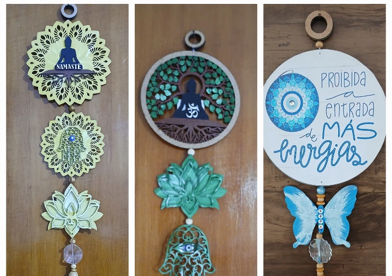 Trabalho com Mdf ,onde realizo os cortes das minhas peças, realizo a pintura das mesmas e faço a decoração com pedras miçangas e tassel.